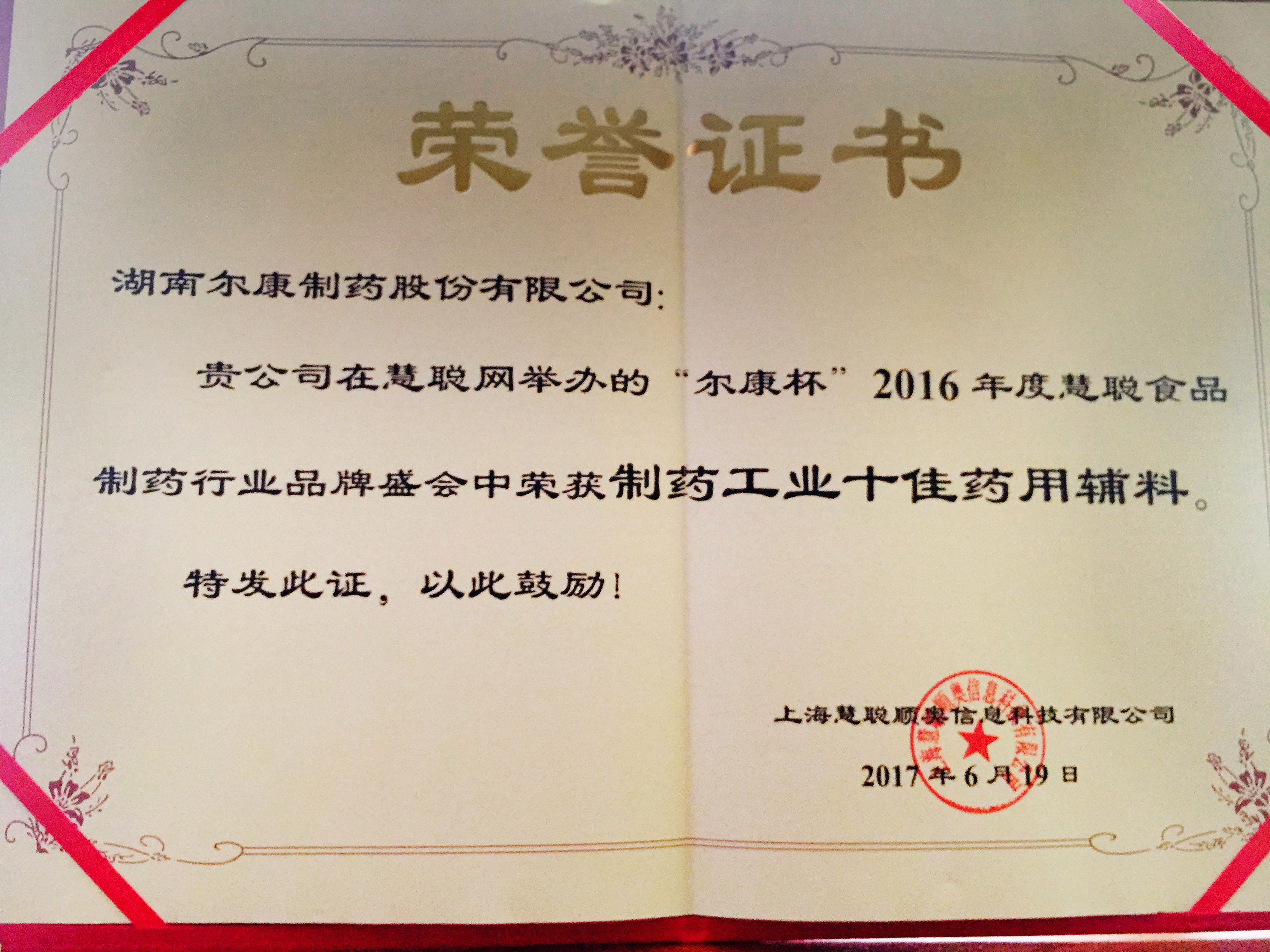 6月19日—20日,2016年度慧聰網食品制藥行業品牌盛會在上海召開,爾康制藥位列“制藥工業十佳藥用輔料品牌”獎項第一名,公司董事、副總經理王向峰代表公司接受獎項并向大會致辭。