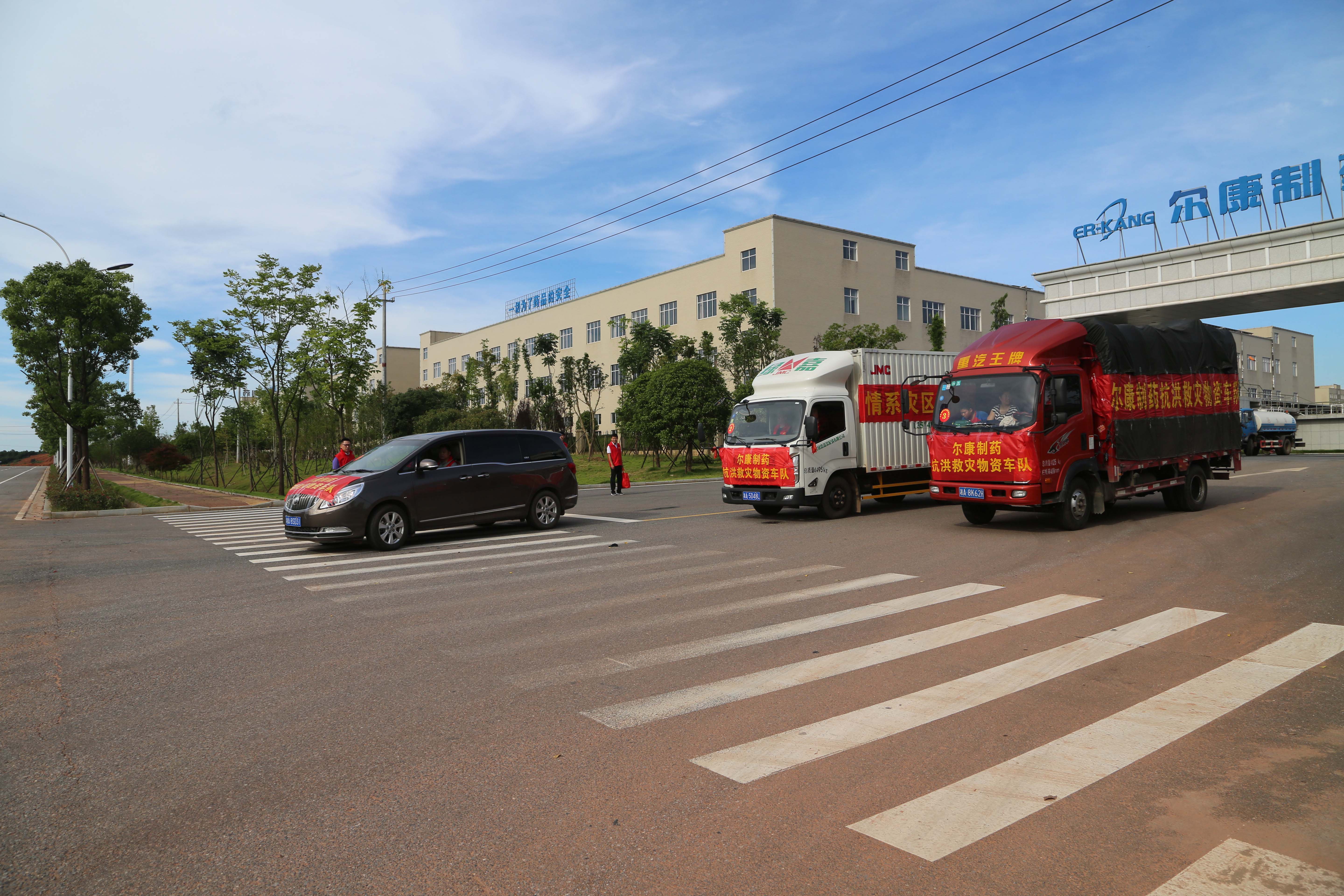 滿載救災物資的3輛車從爾康制藥總部出發