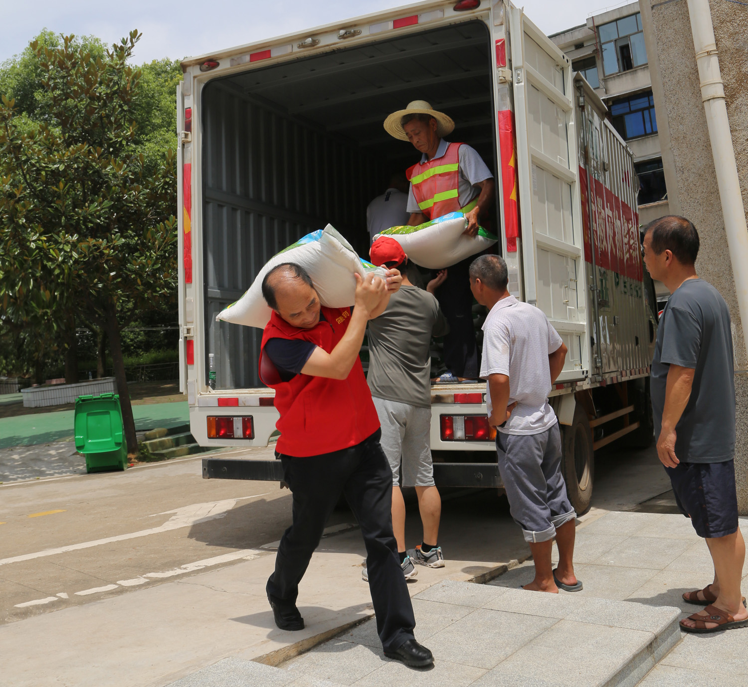 7月6日早上7點,還未到上班時間,爾康制藥的工作人員就忙著將大米、食用油、棉被等抗洪救災的生活物資裝上卡車,準備運往災區,盡管炎熱的天氣讓工作人員早已汗流浹背,但大家表示能為抗洪救災工作奉獻一份力量,流點汗不算什么。