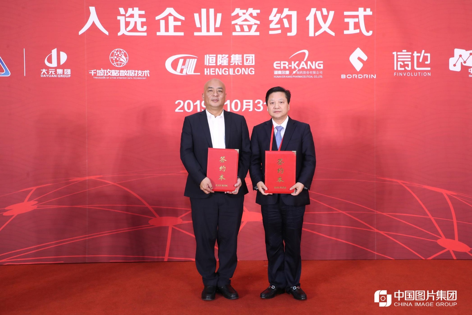新華社總經理室副總經理兼新聞信息中心副主任潘海平(左)與爾康制藥董事長帥放文(右)交換協議文本